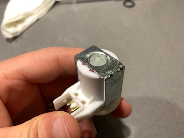 Solenoide es la palabra, es una bobina o solenoide, así que tienes que mirar resistencia entre bornes, debería dar entre 200-500 ohms. Si da circuito abierto, el solenoide se ha cortado y por eso falla.