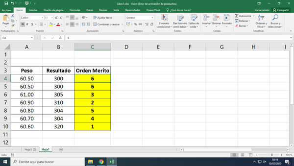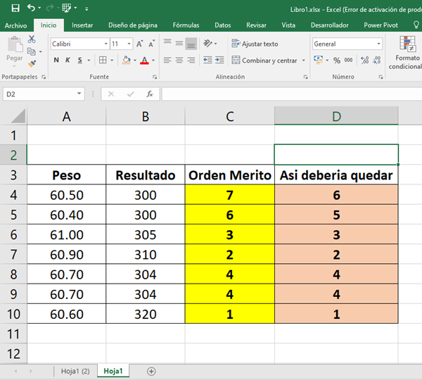 Por ejemplo aquí es un resultado de un campeonato de potencia, si se dan cuenta aquí se evalúa por dos criterios por resultado y peso corporal, si se fija en el resultado 304 hay dos deportista que levantaron el mismo peso pero por pesar menos 1 grano menos lo coloca una posición más arriba y la segunda es la del resultado 300 si se da cuenta allí tiene el mismo peso corporal y levanto el mismo peso y le asigna el mismo orden de merito, utilice esta formula pero solo me sale para un criterio, esta formula lo calcula sin perder su consecutivo en el orden de merito lo cual lo deseo por dos criterio:
