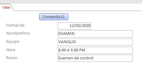 Tengo una BD en la cual el usuario diligencia un formulario y llena los campos de fecha de cita, procedimiento, equipo a usar, hora, razon del procedimiento.