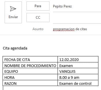 Al enviar el correo este se guarda en la tabla y me devuelve al formulario en blanco de acces, para realizar otra cita.