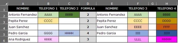 Necesito conocer el número de valores únicos en un rango de celdas NO ADYACENTES (separadas por otras columnas, por lo que no puedo establecer un rango. En el ejemplo que pongo más abajo necesito saber cúantos números de teléfono hay distintos en cada fila. Contando también que cualquier celda de teléfono puede estar vacía