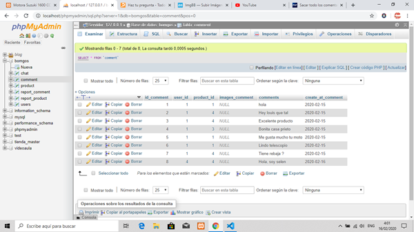 Hay 7 comentarios que los he introducido con el mismo usuario, la parte de la inserción de datos esta muy bien, mis problema es sacar los comentarios correspondiente a cada publicación.
