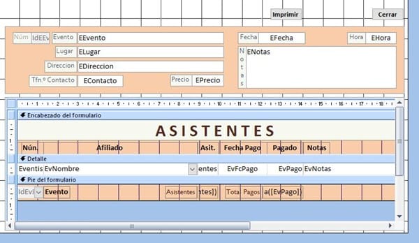 Con ellas he creado un formulario, FrEventos, con los datos de la TbEventos, con un subformulario, SFrEventos, con la TbEventistas, tambien con todos sus datos.