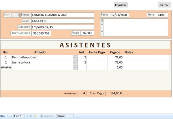 Hasta aquí bien, si eligo un evento en el formulario, el Subformulario me da los datos de los que están apuntados a ese evento.