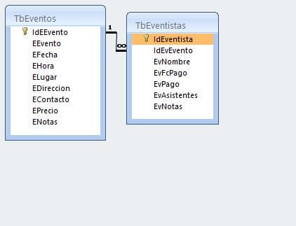 La TbEventistas, el índice, también autonumérico, se llama IdEventista, y tiene otro campo llamado IdEvEvento, con el que se relaciona con la TbEventos.