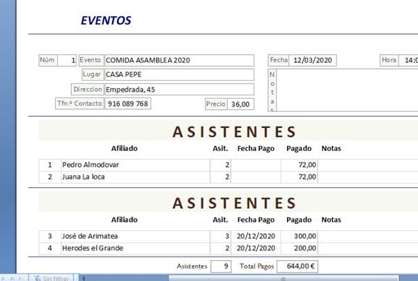 Si no le doy filtro, el programa me presenta el informe con los datos del evento que tengo en pantalla, y todos los eventistas, sean o no de ese evento.