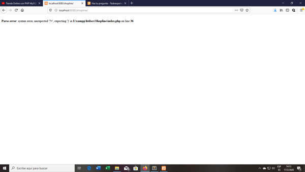 Estoy desarrollando una tienda virtual para programación y tengo un error en la linea 36 del index.php, no visualiza la pagina ¿cómo soluciono el inconveniente?, dejo la estructura del codigo con la cual estoy trabajando...