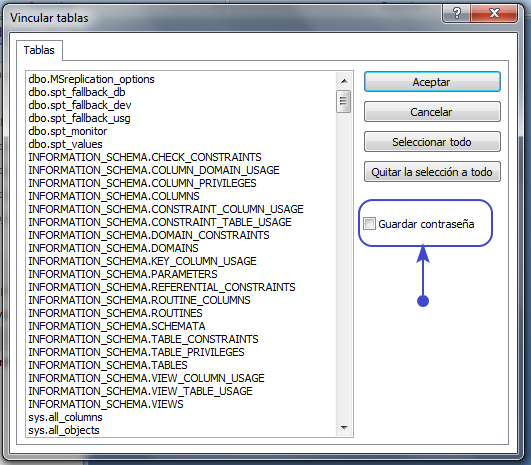 Desde access hago consultas a un servidor SQL. Lo que necesito es que me guarde el usuario y contraseña que le escribo para no tener que escribirla cada vez que entro a access. En mi empresa, hay un usuario y contraseña creada para esa conexión pero en cuanto me salgo de access, si luego vuelvo a entrar me la vuelve a pedir. ¿Hay alguna forma de que no la pida y la guarde?