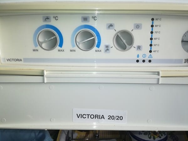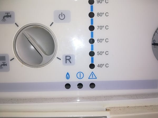 El costado, el triangulito de alerta y los numeros laterales. Nos daba como un codigo 50-60-90, pero no aclaraba muy bien que generaba el problema. Logre resolver el tema agua caliente con un boton rojo pequeño que tiene dentro la caldera, pero al reiniciar se volvia a bloquear.