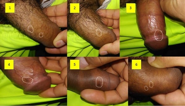 Soy un joven de 22 años y necesito de su ayuda. Hace aproximadamente 7 años tengo estas manchas oscuras en mi parte íntima. Desde entonces he acudido con dos doctores, los cuales me dicen que es normal tener esas manchas, la verdad no me encuentro muy convencido de sus respuestas ¿en verdad es normal tener estas manchas en los genitales?, cabe hacer mención que ninguna de ellas presenta un aspecto verrugoso, son totalmente planas y de un color oscuro, nunca he tenido relaciones sexuales. La verdad es que estoy muy preocupado ya que apenas me exploré y encuentro unas nuevas manchas en la parte inferior de mi miembro (6) (la verdad no sé si las tenía desde hace tiempo, ya que nunca las había visto), temo pueda tratarse de papulosis bowenoide, no sé ustedes que opinen. Las machas que se encuentran del 1-5 no han presentado cambios desde hace 7 años. Hay veces que siento como un pequeño piquete pero es muy fugaz. Quizás se deba a que me manipulo mucho (me masturbo una vez cada día). Espero su respuesta y de antemano muchas gracias por su atención.