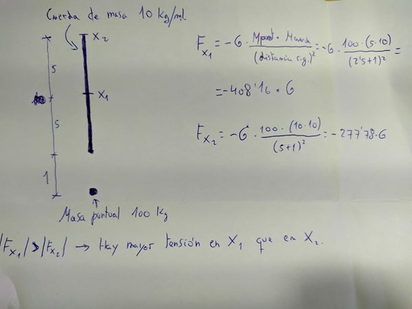 Si tomamos un punto a 5 metros del extremo de la cuerda y calculamos la fuerza aplicada a la cuerda en ese punto, ésta será proporcional a los 50 kg de masa total de ese tramo de cuerda y al inverso de la distancia al cuadrado de los centros de gravedad, en este caso: F=-G*Mpuntual* 50/(2.5+1)^2= -4.08 G*Mpuntual N. Siendo G la constante de gravitación universal y Mpuntual la masa del elemento puntual.