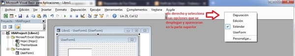 He abierto una tabla de excel y luego he ido al visual Basic pero no me aparece la parte superior donde se encuentran las herramientas y no encuentro el modo de activarla