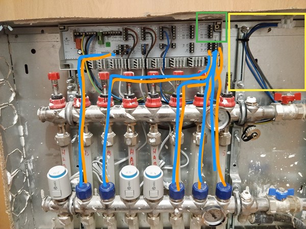 Mi idea es meter 5 valvulas termoestáticas para completar todos los circuitos. Los cableados de las valvulas los tengo claros pero no tengo ni idea de como conectar la parte termostato caldera al panel y necesito un poco de ayuda. Podría seguir la lógica del resto de termostatos pero este último al incluir caldera no lo tengo nada claro.