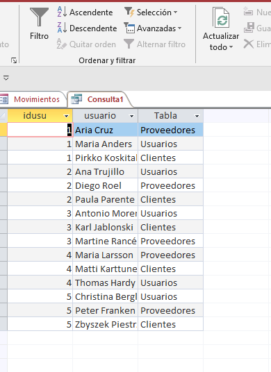 Como pueden ver los Id se repiten, pero, son de diferentes tablas, Los Id con numero uno son de las tablas Usuario (Eder Monterroza), Clientes (Nubadis García), Proveedor (Eduardo Usme), lo mismo para los id con el numero dos. Por favor agradezco me expliquen como debo proceder para hacer la consulta o como debo armar la tabla movimientos para poder hacer la consulta. Yo pensaba en armar una sola tabla que se llame terceros, pero nada, necesito las tres tablas. El lio es que el sistema no es adivino para saber a que id pertenece el numero registrado, si es de la tabla Usuario, o si es de la tabla Clientes o si es de la tabla proveedor. Por favor pido encarecidamente me expliquen esta parte, pues no he podido dar con una solución. Desde ya doy miles y miles de gracias a la persona que me ayude.