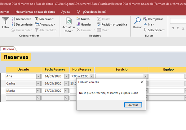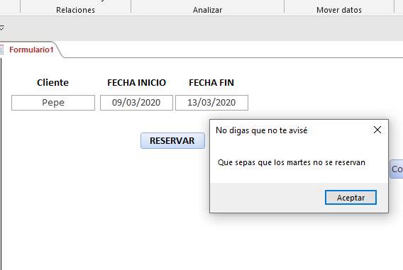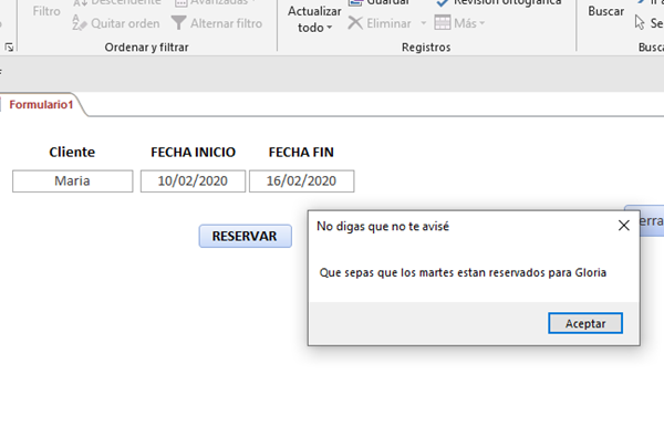 Private Sub FechaReserva_AfterUpdate() If Format([FechaReserva], "dddd") = "Martes" And Usuario <> "Gloria" Then MsgBox "No se puede reservar, es martes y es para Gloria", vbOKOnly, "Háblalo con ella" Usuario.SetFocus FechaReserva = "" End If End Sub