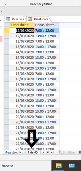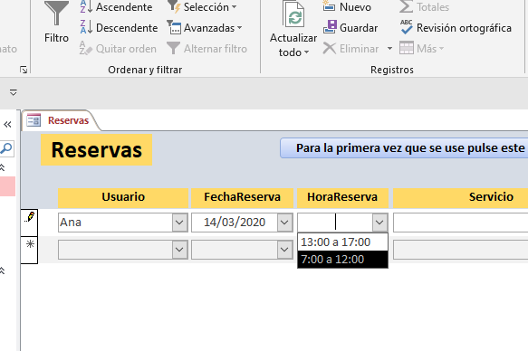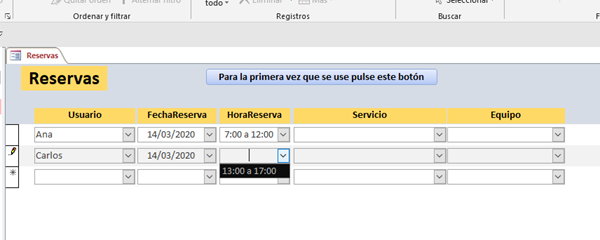Private Sub Comando10_Click() Dim i As Byte For i = 1 To DateSerial(Year(Now()), Month(Now()) + 1, 0) - DateSerial(Year(Now()), Month(Now()), 1) DoCmd. RunSQL "Insert into diaslibres(diaslibres, horaslibres)values(dateSerial(Year(Now()), Month(Now()), 1)+" & i & ",""7:00 a 12:00"")" DoCmd. RunSQL "Insert into diaslibres(diaslibres, horaslibres)values(dateSerial(Year(Now()), Month(Now()), 1)+" & i & ",""13:00 a 17:00"")" DoCmd.RunSQL "delete * from diaslibres where diaslibres<=Date()" Next End Sub Private Sub FechaReserva_BeforeUpdate(Cancel As Integer) If Format([FechaReserva], "dddd") = "Martes" And Usuario <> "Gloria" Then MsgBox "No se puede reservar, es martes y es para Gloria", vbOKOnly, "Háblalo con ella" End If End Sub Private Sub FechaReserva_GotFocus() FechaReserva.Requery End Sub Private Sub HoraReserva_AfterUpdate() DoCmd.RunSQL "delete * from diaslibres where diaslibres=forms!reservas!fechareserva and horaslibres=forms!reservas!horareserva" End Sub Private Sub HoraReserva_GotFocus() HoraReserva.Requery End Sub