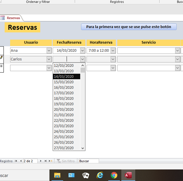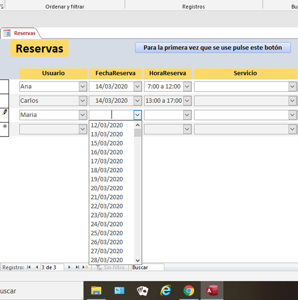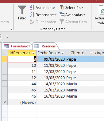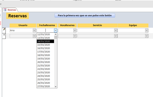 Vamos a suponer que llega María y quiere reservar el 12/03/2020, que puedes ver que ya está reservado por Pepe( y como somos unos machistas se lo asignamos a él)