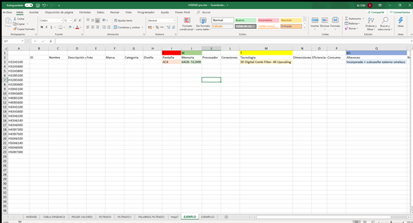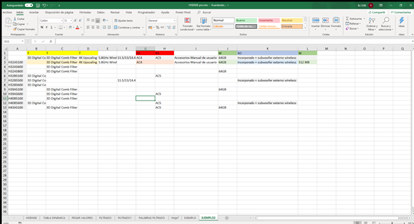 Las celdas que contengan características de la televisión y sus primeras columnas estén señaladas con P, M, T SO, añadir la característica (separadas por un guión y un espacio de la anterior característica) en la segunda tabla en su sitio correspondiente.