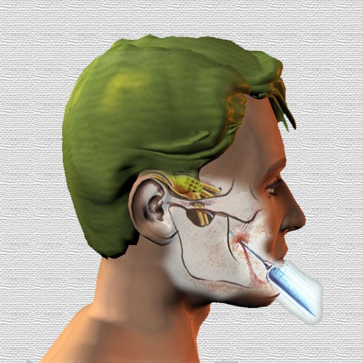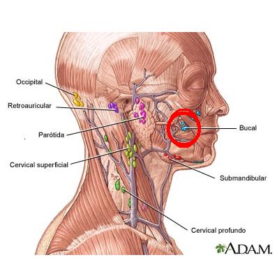 Dada la zona, pienso que es remotamente posible que pueda estar relacionado con los dientes o la boca (en el interior), pero es dificil, porque en esos casos se trata de infecciones y estan siempre suelen cursar con dolor. Mucho ánimo.