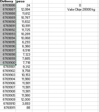 Tengo una lista de entre 50 y 100 valores que son en kg requiero usar solver para que la suma me de lo más optimo o cercano a 28000 kg es decir me puede dar valores de 27678.20 no es necesario que forzosamente me de los 28000 kg exactos.