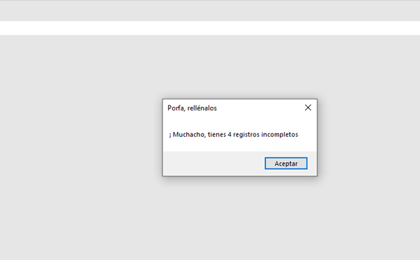 MsgBox "¡ Muchacho !, tienes " & i & " registros incompletos", vbOKOnly, "Porfa, rellénalos"De forma que cuando voy a abrir el formulario, pero ya te digo que lo puedes poner en cualquier lugar.