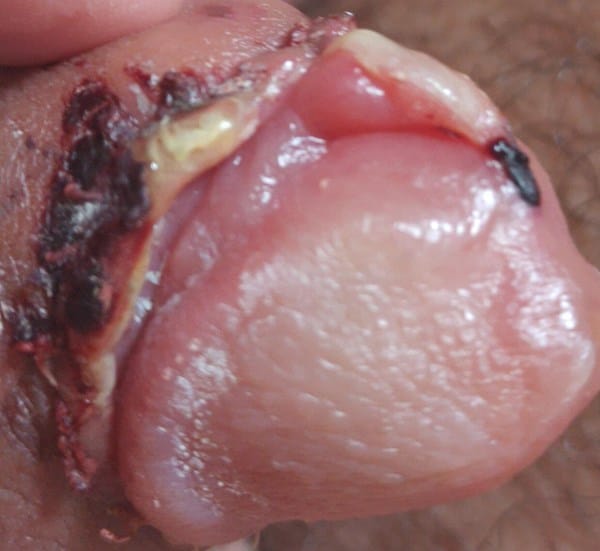 No os preocupéis por lo negro, Me tuvieron que quemar el glande por que me desangraba y la piel se esta recuperando de las quemaduras.