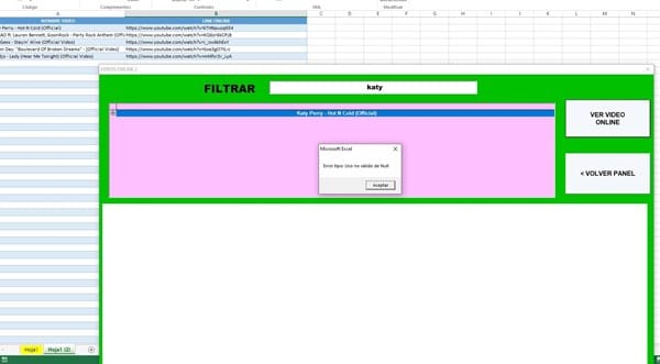 Soy nuevo en este foro y la verdad me pareció muy interesante, hace poco me metí en este entorno de Excel y VBA, y gracias a ustedes he aprendido mucho. Te quería hacer una consulta sobre una duda que estoy teniendo con un programita que estoy haciendo en VBA (Algo sencillo como para ir aprendiendo más), tengo un listbox en donde tengo dos columnas en una tengo nombre de vídeos de Youtube y en la otra columna su respectivo enlace o vinculo, al seleccionar el nombre del vídeo en el Listbox en el WebBrowser de abajo me apare un vista previa del vídeo y si presiono el botón que dice VER VIDEO ONLINE abre el vídeo en el navegador. Ahora mi consulta es la siguiente: al realizar el filtrado para buscar el nombre del vídeo y presiono el botón VER VIDEO ONLINE me sale un error (Imagen2), busque en muchas parte y no consigo encontrar solución o quizás la encontré y no le estaría entendiendo a la solución. Te agradecería muchísimo si me podrías dar una respuesta y una solución, te lo consulto porque vi que sos de las personas que más sabe sobre estos temas y que diste millones de soluciones. Te lo agradecería de corazón para ir aprendiendo un poco más sobre este entorno. Te dejo los códigos abajo