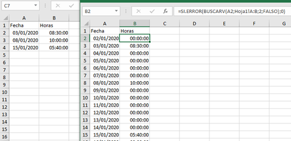 Tengo en hoja 1 de excel fecha y horas trabajadas aclaro que faltan fechas porque no se trabajo y quiero que las horas trabajadas se copien en otra hoja que tienen solamente fechas en esta no faltan fechas, como hago para que las horas de la hoja 1 coincidan con las fechas de la hoja 2. Por ejemplo en la hoja 1 tengo lo siguiente 01/02 trabajo 8:30 hs 02/02 no trabajo por ende esta fecha no figura en la hoja 1 03/02 trabajo 9 hs y en la hoja 2 tengo las tres fechas yo necesito que las hs se copien en su correspondiente fecha y en la fecha faltante ponga cero o nada. Bueno espero haberme explicado.
