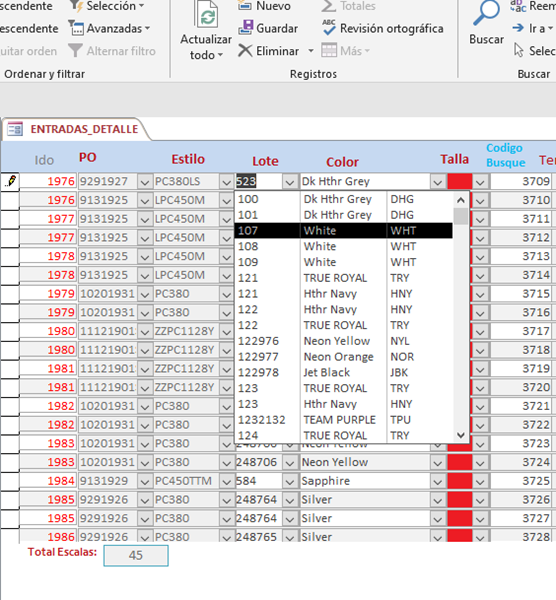 Por(combo) codestilo(combo) lote(combo) codcolor(combo) talla(combo)