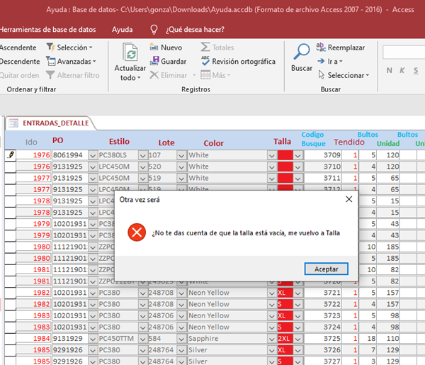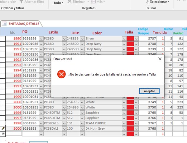 Estoy trabado en un Formulario continuo, Exactamente en Cuadros Combinados en cascada: cuando ingreso un nuevo registro El programa funciona(Cuadros combinados) los combos en cascada, el problema esta en la modificación de los combos y exactamente en el ultimo. Al no coincidir con los anteriores combos queda vacío osea no carga nada, Y ESO ESTA BIEN, lo que no quiero es que siga adelante o que NO PUEDA GUARDAR, a pesar de que salio vacío el cuadro combinado deja pasar a la siguiente caja y guarda el dato que se guardo por primera vez guardando una información falsa o no escogida.
