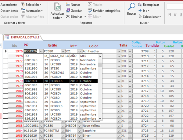 *****EL COMBO LOTE AL ESCOGER UN REGISTRO LLENA EL SIGUIENTE COMBO CODCOLOR Y TAMBIEN LLENA TALLA DE ACUERDO A LO QUE ESCOGIMOS OSEA PO,ESTILO, Y COLOR SI LOS TRES COMBOS ESTAN EN EL PEDIDO APARECE LA TALLA, PERO SI NO COINCIDE ESOS 3 COMBOS NO APARECE NADA EN EL COMBO TALLA (HASTA TODO BIEN).