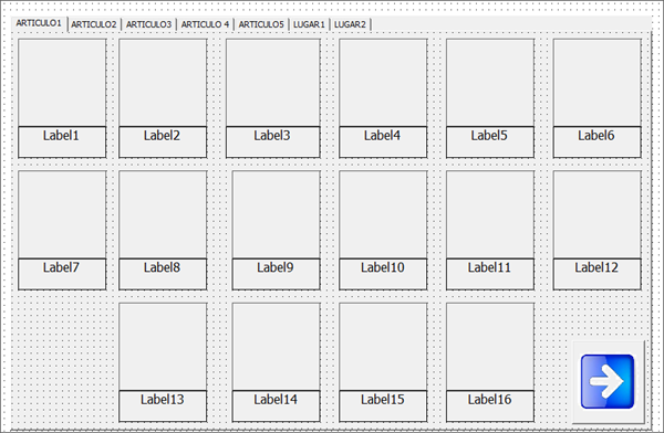 Hasta ahora he conseguido crear el formulario con las páginas necesarias, y cargar los cuadros de imagen y los labels, de las páginas ARTICULO1, ARTICULO2, ARTICULO3, ARTICULO4, Y ARTICULO5, todo esto en el formulario BUSCARARTICULO.Form, una vez que se ve el formulario cargado, necesito saber en que cuadro de imagen hago clic, para pasar a la página ("LUGAR1") y ahí rellenar los cuadros de imagen y los labels que tomare de la( fila que sea la misma que clické en la página de ARTÍCULOS) y (las columnas de la C hasta la ultima rellena), y hacer el mismo proceso para el tipo de arreglo.