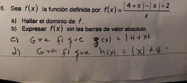 $$\begin{align}&f(x) = \frac{|4+x|-|x|+2}{x}\\&Si\ x>0\\&|x| = x\\&Si \ x<0\\&|x| = -x\\&Si\ x>-4\\&|4+x| = 4+x\\&Si \ x<-4\\&|4+x| = -(4+x)=-4-x\end{align}$$Tenemos 2 cortes en la función, acomodamos la función según los signos que definimos antes para que quede la función partida