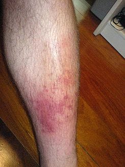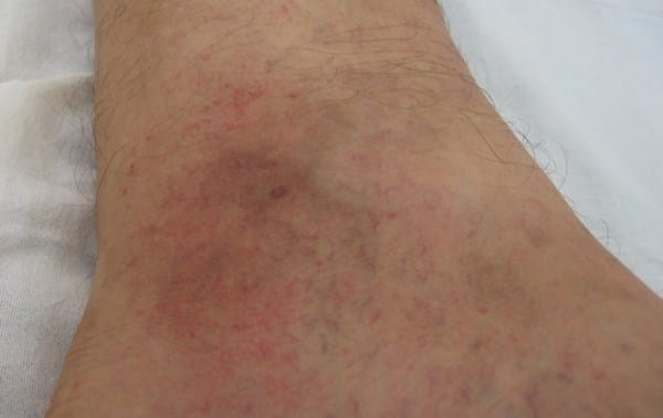 Otra posibilidad, más alejada dentro de mi ignorancia, es como ha dicho el experto Saludable, que se trate de una circulación de la sangre deficiente, se suele denominar como 'dermatitis por estasis', en un grado mayor (el grado siguiente), puede convertirse en una ulceración.
