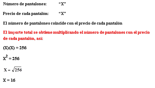 Un comerciante ha comprado cierto número de pantalones por 256 córdobas. Sabiendo que el número de pantalones coincide con el precio de cada pantalón. El número de pantalones comprados por el precio de cada pantalón es igual al importe total, ¿cuántos pantalones compró?