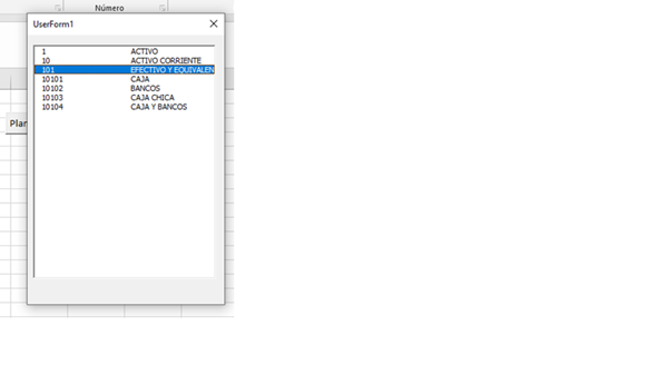 Tengo un formulario con el listbox1 y quiero que al posicionarme encima del textbox me dijitar al código 1001, es decir columna 0. El plan esta en la hoja2 en a2 código y b2 nombre cuenta el listbox tiene 2 columnas