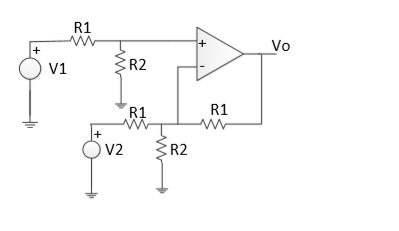 Me pide hallar la tensión de salida. Lo que yo he hecho es aplicar el teorema de superposición, es decir, calculo la tensión de salida anulando una de las fuentes. Al anular V2 no se como hallar la salida porque entre Vo y V1 no hay conexión.