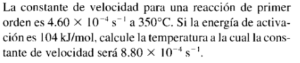 La constante de velocidad para una reacción de primer orden es 4,60 x10-4 s-1 Si la energía de activación es de 104 kJ/mol, calcule la temperatura a la cual la constante de velocidad será de 8.80× 10–4 s–1