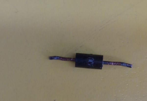 En las imágenes se pueden ver la tarjeta, en la otra la parte dónde iba el diodo que está recalentada, y el diodo que lo pegué para poder ver el código, pero fue imposible. Por la posisción que ocupa me impresiona que sea un diodo TVS.