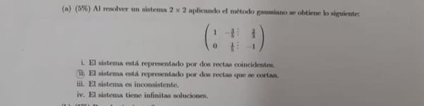 Como la matriz quedo 'bien triangulada' (si es que existe esa expresión), entonces el sistema tiene una sola solución, lo que significa que las 2 rectas se cruzan (respuesta ii)