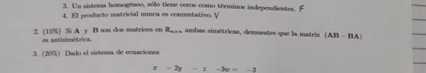 MatemáticasProfesoresCiencias e Ingeniería Andrea perez el 1 abr. 20 Si A y B son dos matrices pertenecientes a Rnxn, ambas simétricas demuestre que la matriz (AB-BA) es antisimetrica Como puedo demostrar este punto para que (AB-BA) sea antisimetrica Seguir Siguiendo Dejar de seguir