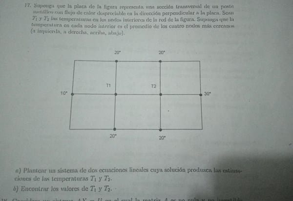 Me explicarían como plantear dos ecuaciones para dar solución estimada a las temperaturas 1 y 2, teniendo en cuenta que la temperatura en cada nodo interior es el promedio de los cuatro nodos más cercanos