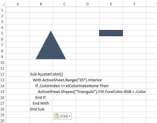Tengo esta macro que se puede ver en la imagen adjunta que al rellenar la celda "E5" de un determinado color, haciendo click en el triangulo el mismo toma ese color, lo que necesito es la opcion de dejar sin relleno la celda "E5" y que el triangulo quede transparente