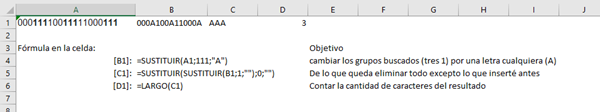 Si en el rango A1:H1, se encuentra la siguiente serie de números: 00011110011111000111 se salte los ceros de adelante y cuente solo los 1 que se encuentren tres veces seguidos y que los demás números lo salte hasta que encuentre nuevamente tres números 1 seguidos. Es como si contara en bloque solo los números unos que estén de a tres.