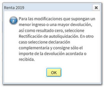 Esta solicitud se realiza para iniciar un procedimiento de rectificación de una autoliquidación de 2019, por resultar una cantidad a devolver superior a la solicitada o una cantidad a ingresar menor. También se utilizará esta opción si necesita informar de un dato que no afecta al resultado de la declaración.