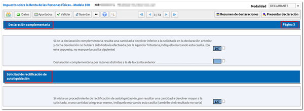 Se accederá directamente a la página de la declaración en la que indicar el tipo de modificación: si se trata de una declaración complementaria o una rectificación de la autoliquidación, apartado "Datos generales".