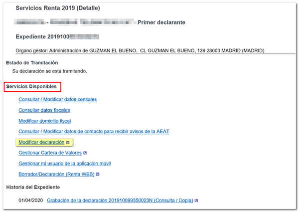 Revise que su declaración esté presentada: en "Estado de la Tramitación" aparece el mensaje "Su declaración se está tramitando" y en "Historia del Expediente" dispone de la "Grabación de la declaración". Para acceder a la rectificación, en "Servicios Disponibles", haga clic en la opción "Modificación de declaración".