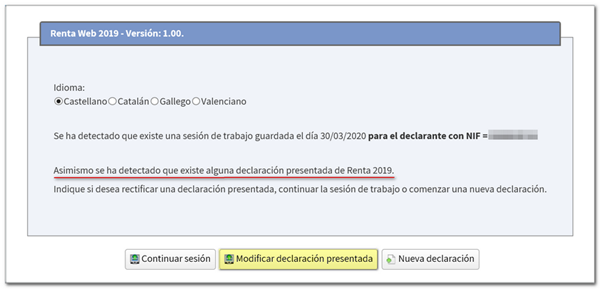 Al iniciar Renta WEB se mostrará una ventana para continuar con la última sesión de trabajo guardada, modificar la declaración presentada o generar una nueva declaración. A continuación pulse "Modificar declaración presentada".