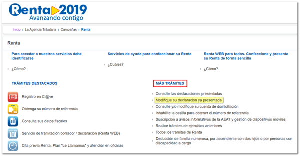 El acceso a la opción " Modificación de una declaración ya presentada" puede realizarse desde el portal Renta 2019, en el apartado "Más trámites", "Modifique su declaración ya presentada".