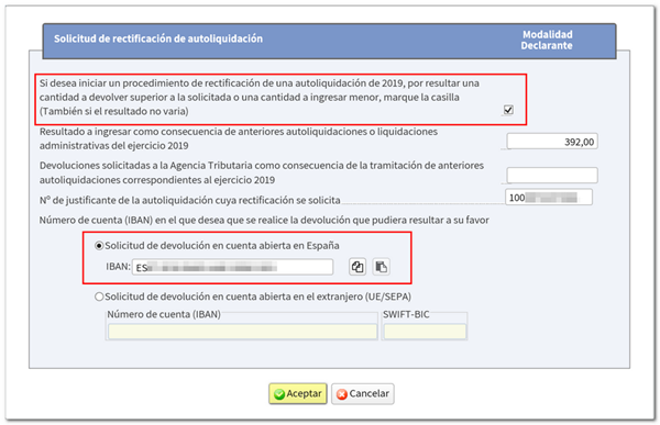 Marque la casilla 127 y, en la nueva ventana, la opción "Si desea iniciar un procedimiento de rectificación...". Se mostrarán los datos de la anterior autoliquidación: el resultado a ingresar de anteriores autoliquidaciones o liquidaciones administrativas correspondientes al ejercicio 2019 (casilla 670) o bien el resultado a devolver (casilla 695) y el "Número de justificante de la autoliquidación" de la autoliquidación cuya rectificación se solicita. Además, indique el número de cuenta (IBAN) en el que desea que se realice la devolución. Como novedad, siempre que en Renta WEB disponga del campo IBAN podrá copiar en el portapapeles el código y pegarlo en cualquier otro momento en la sesión.